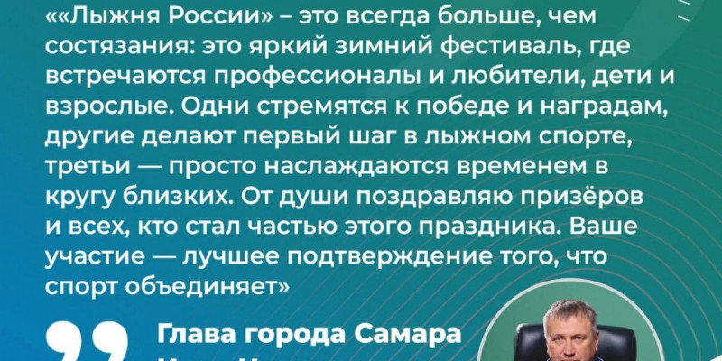 «Во всех городах «Лыжня России» – это всегда больше, чем состязания: это яркий зимний фестиваль, где встречаются профессионалы и любители, дети и взрослые. Одни стремятся к победе и наградам, другие делают первый шаг в лыжном спорте, третьи — просто наслаждаются временем в кругу близких. От души поздравляю призёров и всех, кто стал частью этого праздника. Ваше участие — лучшее подтверждение того, что спорт объединяет», – сказал глава города Самары Иван Носков.