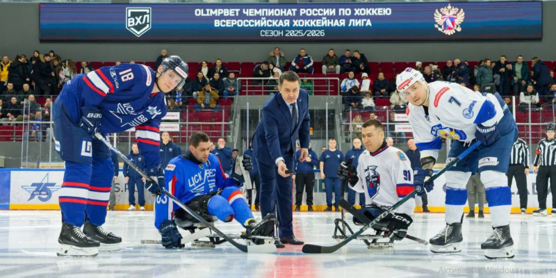 В первом вбрасывании приняли участие следж-хоккеисты, ветераны специальной военной операции: Самат Тимиров, награжденный Орденом мужества, и Сергей Артищев, награжденный медалью «За отвагу».