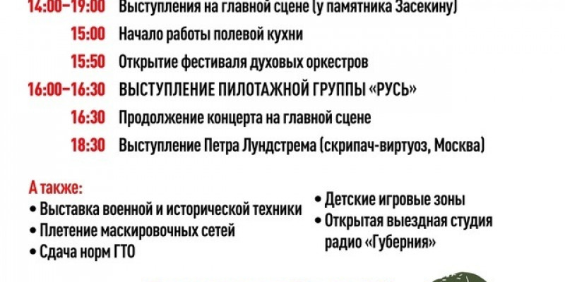 В течение дня будут работать 36 интерактивных патриотических площадок, включая военно-исторические музеи, 3 точки общественного питания полевых кухонь, спортивные площадки сдачи нормативов ГТО, анимационные площадки для детей, художественную мастерскую с мастер-классами «Открытое письмо», пункт отбора в ряды Вооружённых Сил Российской Федерации, главную сцену возле памятника основателю Самары князю Засекину, а также малую сцену у бассейна ЦСКА ВВС с тематическим концертом к 100-летию Дома офицеров Самарского гарнизона.