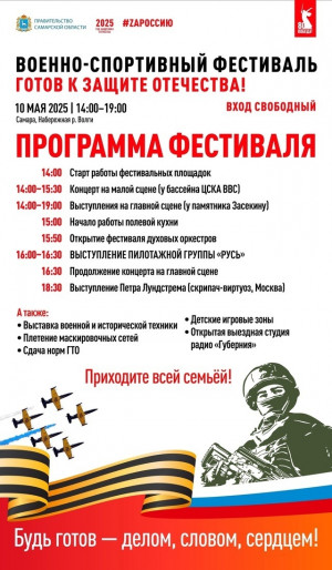 Военно-спортивный фестиваль «Готов к защите Отечества» состоится в Самаре 10 мая на набережной реки Волга от памятника Григорию Засекину до бассейна ЦСКА ВВС. Он станет продолжением празднования 80-летия Великой Победы. Фестиваль посвящён Году Защитника Отчества, который объявлен Президентом России Владимиром Путиным.