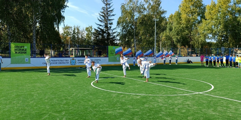 По соседству с площадкой - школа и детский сад. Юные тхэквондисты и футболисты первыми опробовали новое сооружение: провели показательные выступления и футбольный матч.