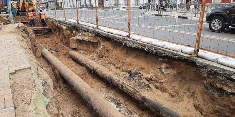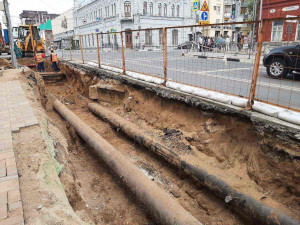 В историческом центре вскрыто дорожное полотно в районе площадки строительства со стороны перекрестка улиц Вилоновской и Галактионовской. На этой неделе здесь началась переукладка двух газовых магистралей.