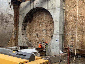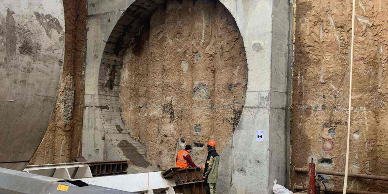 «Основная часть тоннелепроходческого комплекса сейчас сваривается, монтируется. Следующим в монтаж пойдет ротор щита, ”юбка”, шнек, а также будут подключаться все телеги ТПМК – они будут навешиваться на основное оборудование. Стоит отметить, что один из главных элементов конструкции – ротор. Это часть щита, которая разрабатывает породу путем ее разрушения. То есть сначала ротор «врежется» в стартовое кольцо. Далее уже разработанная порода попадает в специальную камеру, перемешивается и выдается шнековым конвейером на ленточный транспортер. С него она уходит в вагонетки и башенным краном поднимается на поверхность в грунтоприемник, откуда после будет вывозиться самосвалами на полигон. Локомотивы же будут перемещать по рельсам составы с вагонетками, емкостями с тампонажной смесью и самой обделкой. На первоначальном этапе врезки сразу не потребуется большое количество вагонеток. Откатка будет осуществляться по второстепенному пути, – рассказал заместитель главного инженера, представляющий тоннельный стройотряд № 6 метростроя, Василий Костроменков. – Самое важное оборудование уже завезено на стройплощадку. Планируем закончить монтаж щита до 15 апреля. Вся работа идет по графику. Главное из того, что собрано, – основные конструкции самого ТПМК и технологические тележки, которые будут ехать за ним Порода здесь – пески и суглинки, которые не должны вызвать никаких затруднений при проходке».