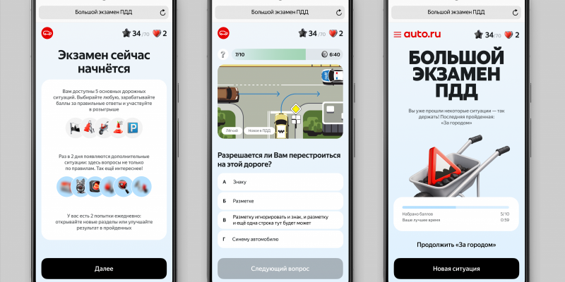 «Мы развиваем Большой экзамен ПДД Авто.ру, чтобы движение на дорогах становилось более безопасным и комфортным для всех. Игровой формат помогает выявить пробелы в знаниях правил и сложных дорожных ситуаций, а также разобраться в вопросах, связанных с владением и эксплуатацией машины, которые не встречаются в автошколе», — комментирует Ксения Зарецкая, руководитель сервиса Авто.ру.