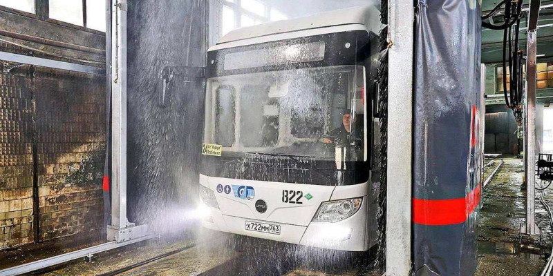 С помощью автоматических щеток кузова отмываются качественно и при этом быстро. Портальная автомойка справляется со всем сразу, она запрограммирована на несколько режимов, в том числе есть сушка и обработка воском. Водителям больше не требуется выходить из автобуса. Среднее время помывки одного автобуса снаружи сокращено до 6 мин.