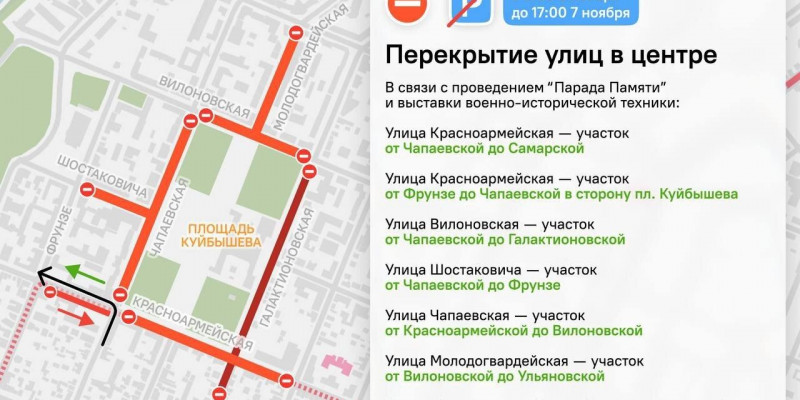 В Самаре 7 ноября на площади им. В.В. Куйбышева состоится Парад Памяти. На период его подготовки и проведения в историческом центре Самары временно скорректируют движение транспорта, в том числе общественного.