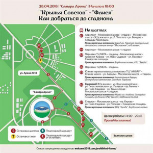 Также организаторы сообщают, что на "Самара Арене" 28 апреля организуют восемь точек питания, в которых можно будет купить выпечку, прохладительные напитки, кофе и чай. Они будут находиться на втором ярусе по периметру стадиона, один буфет будет обслуживать vip-гостей. Рассчитываться за покупки можно будет только наличными.