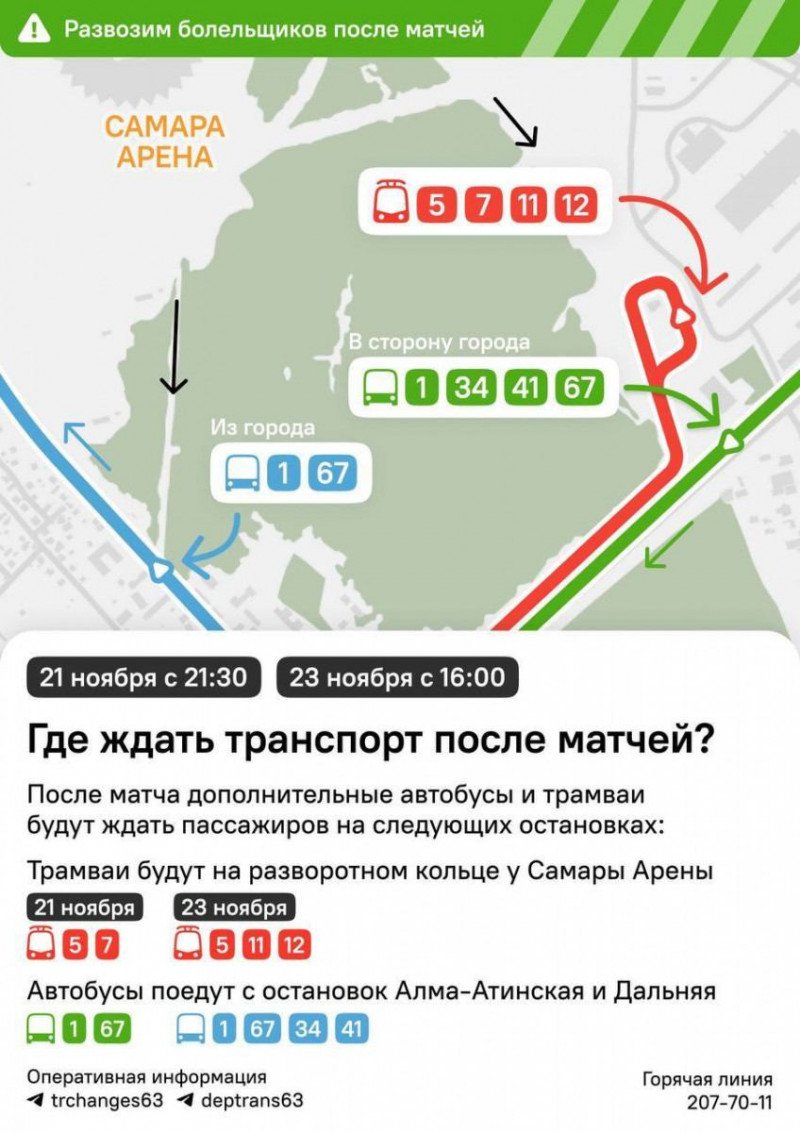 В период с 17:30 до 22:00 21 ноября, а также с 12:00 и до 16:30 23 ноября перевозчики обеспечат непрерывный контроль за бесперебойной работой муниципальных трамвайных маршрутов № 5, № 7 (работает в будние дни), № 11, № 12 (курсируют только в выходные дни), а также №№ 22, 24, 25 и проходящих в районе стадиона автобусных маршрутов №№ 1, 50, 51, 67, 83.