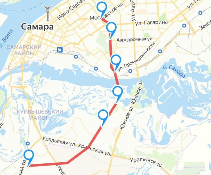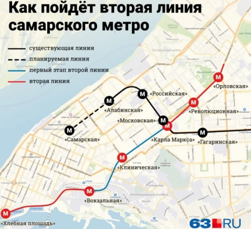 Судя по схеме, метро протянут примерно от Московского шоссе через Гагарина, Партизанскую, Верхне-Карьерную, реку Самару, вдоль Южного шоссе, через Уральскую, Утевскую до Долотного переулка, в районе пересечения с Пугачевским трактом.