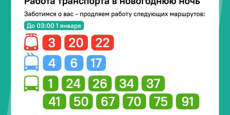 Отметим, что по инициативе руководства «Трамвайно-троллейбусного управления», с 22:00 31 декабря 2025 года до 03:00 1 января 2026 года проезд на трамваях и троллейбусах будет бесплатным.