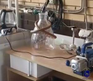 В ходе обысков по месту его жительства, в присутствии понятых, в арендованных мужчиной гаражах сотрудники полиции изъяли пластиковые, стеклянные и металлические тары и канистры с жидкостями и веществами внутри, противогазы, перчатки, вакуумные насосы и другие предметы, используемые для производства наркотического средства, канистры с жидкостями и веществами внутри (химикаты), а также наркотические средства.