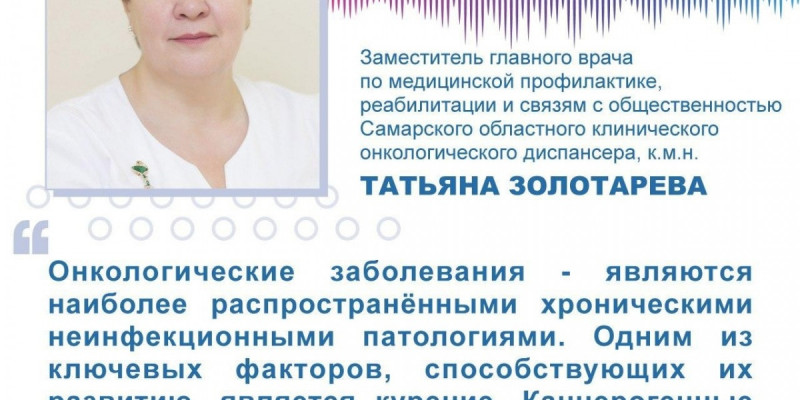 Заместитель главного врача по медицинской профилактике, реабилитации и связям с общественностью Самарского областного клинического онкологического диспансера, к.м.н. Татьяна Золотарева рассказала о влиянии никотина на развитие онкологических заболеваний: