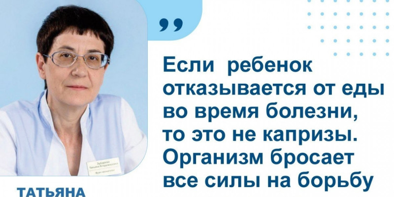 Главное - жидкость! Если ребенок совсем отказывается от еды - не страшно. Страшно, если отказывается от питья. Предлагайте воду, если малыш до года, с года можно лёгкие компоты, морсы, регидратационные растворы (если сильная рвота/жидкий стул), грудное молоко, смесь. Давайте жидкость маленькими ложечками, но часто".