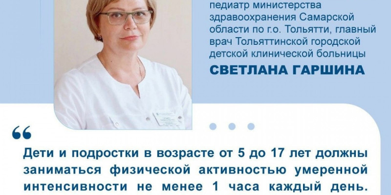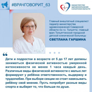 Основным фактором формирования здорового образа жизни у детей и подростков является семья. Об этом, а также о пользе физических нагрузок для развития рассказывает главный внештатный специалист педиатр министерства здравоохранения Самарской области по г.о. Тольятти, главный врач Тольяттинской городской детской клинической больницы Светлана Гаршина: