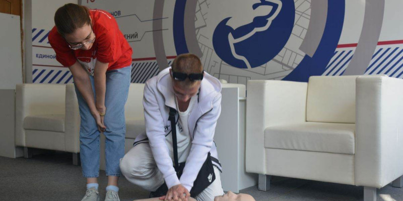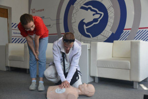 Валерия Артюшина и Вадим Лукин под руководством волонтеров освоили прием Геймлиха и сердечно-лёгочную реанимацию. На манекене отработали главные движения.