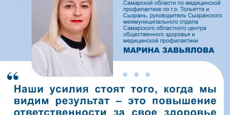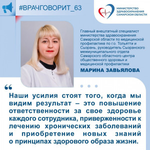 "Ежегодно в организации проводится скрининг-обследование сотрудников Сызранском центре здоровья на выявление основных факторов риска развития хронических неинфекционных заболеваний, индивидуальное консультирование и профилактические беседы. Далее проводятся групповые профилактические мероприятия: акции,тренинги, лекции, при необходимости приглашаются узкие медицинские специалисты", - отметила главный внештатный специалист министерства здравоохранения Самарской области по медицинской профилактике по г.о. Тольятти и Сызрань, руководитель Сызранского межмуниципального отдела Самарского областного центра общественного здоровья и медицинской профилактики Марина Завьялова.