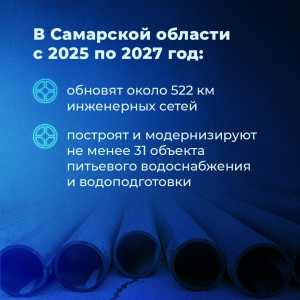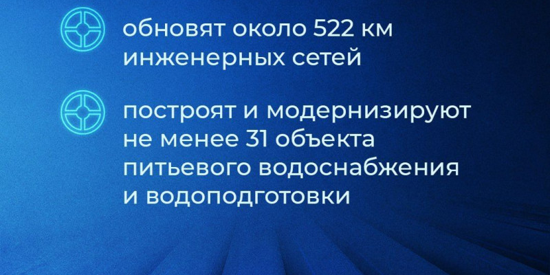 Вице-премьер Марат Хуснуллин отметил, что с 2025 по 2030 год нужно построить и модернизировать более 50 тыс. км инженерных сетей, не менее 2 тыс. объектов питьевого водоснабжения и водоподготовки. Это улучшит качество коммунальных услуг для 20 миллионов россиян. Он рассказал, что к 2030 году планируется ежегодно менять не менее 2,5% сетей, к 2035 году этот показатель должен составить не менее 5%.