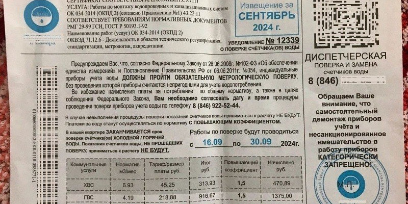 «В вашей квартире заканчивается срок поверки счётчиков... Платежи за воду станут осуществляться по нормативу С ПОВЫШАЮЩИМ КОЭФФИЦИЕНТОМ» - листовки* с тревожным заявлением обнаружили в своих почтовых ящиках самарцы в сентябре. Не в меру активные коммерческие организации снова пытаются навязать свои услуги, даже тем, кому это не нужно. Призывают всех без исключения пройти обязательную поверку счётчиков ХВС и ГВС, в противном случае грозят повышением начислений. В тексте ссылки на законы, масса цифр и терминов - многих такая информационная атака может сбить с толку.