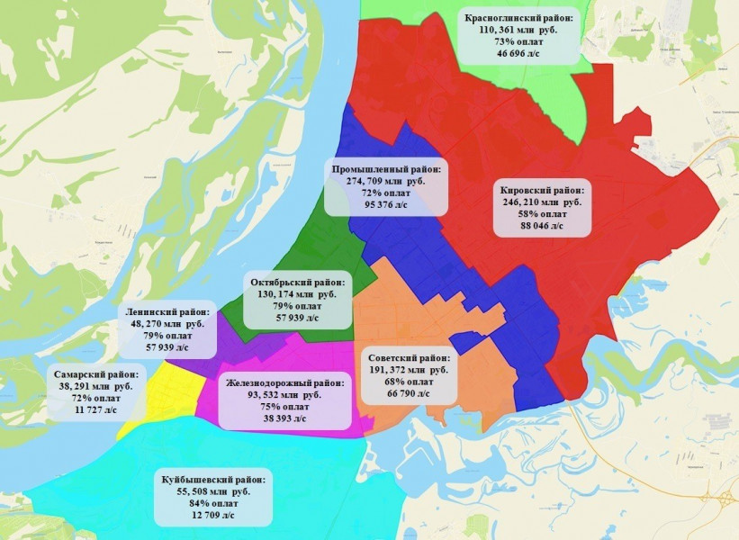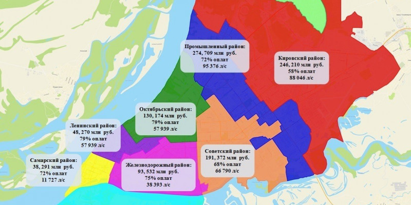 Все данные по районам представлены на карте, которую составили работники ресурсного предприятия в мае 2023 года. Здесь указан долг жителей района в рублях, а также процент оплаты и общее количество лицевых счетов.