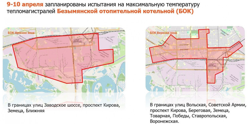 С 9 по 10 апреля испытания затронут сети от Безымянской отопительной котельной в Промышленном и части Советского района, в границах улиц: Вольская, Кирова, Победы, Земеца, Береговая, Ближняя, Заводское шоссе, Советской Армии.