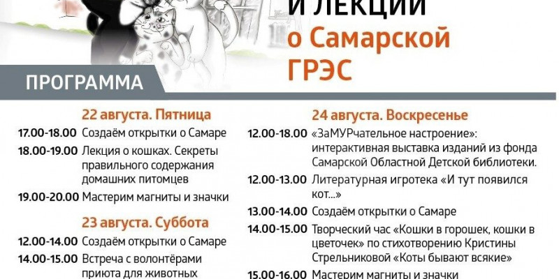Уже сегодня 22 августа, «Т Плюс» ждёт жителей областной столицы у яркой фотозоны с «Кошкой на батарее» — главном символе тепла и уюта, установленного у старейшей в Поволжье электростанции. Всем посетителям будет предложено изготовить памятные открытки с видами Самарской ГРЭС, сувениры и оказать помощь приюту бездомных животных «Участие».