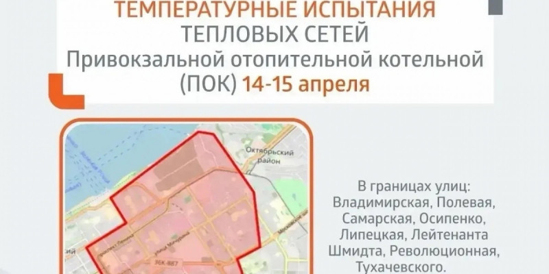 С 14 по 15 апреля специалисты Самарского филиала ПАО «Т Плюс» продолжат испытания тепловых сетей и проверят состояние тепловыводов Привокзальной отопительной котельной в Железнодорожном районе, части Ленинского и Октябрьского районов областной столицы, в границах улиц Лейтенанта Шмидта, Революционной, Мориса Тореза, Авроры, Тухачевского, Полевой и др.